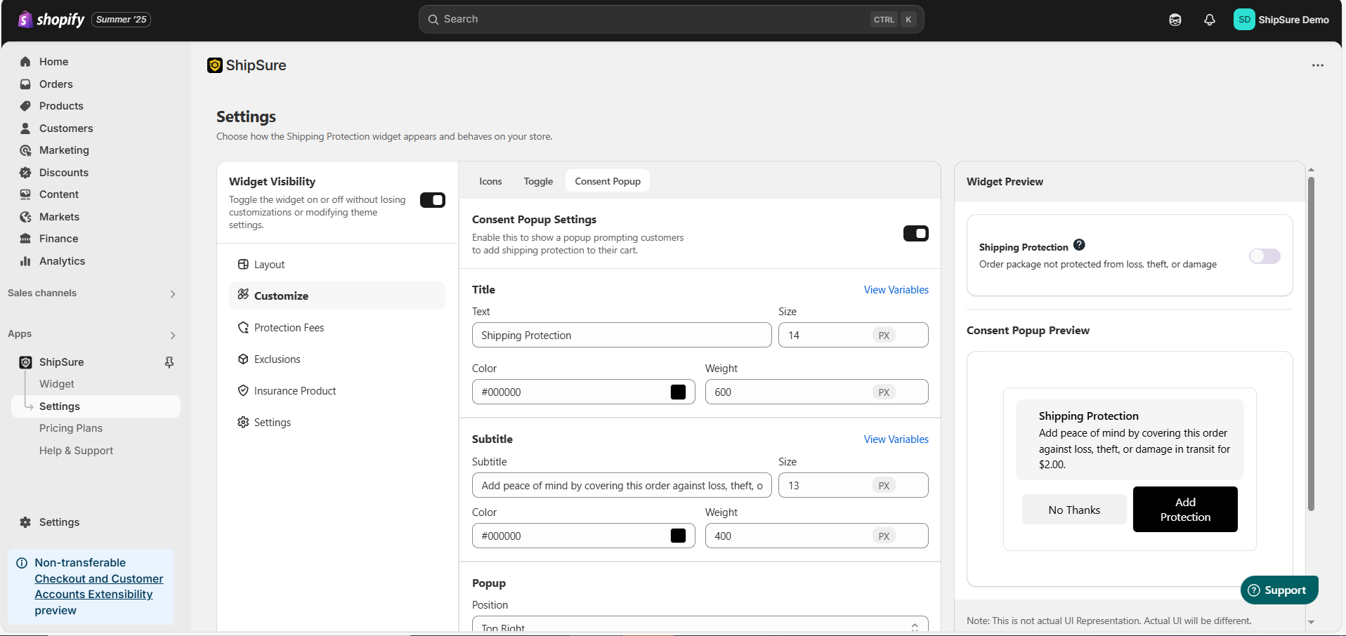 The Consent Pop-Up helps encourage customers to add shipping protection before checkout. You can fully customize its content, appearance, and positioning to match your store branding.